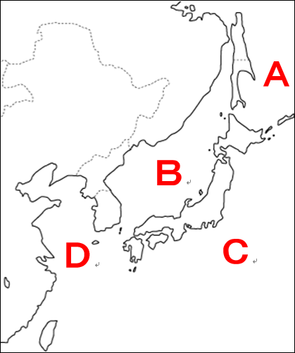 1.日本周辺の海について、下の地図中のA~Dの海の名前をそれぞれ答えなさい。