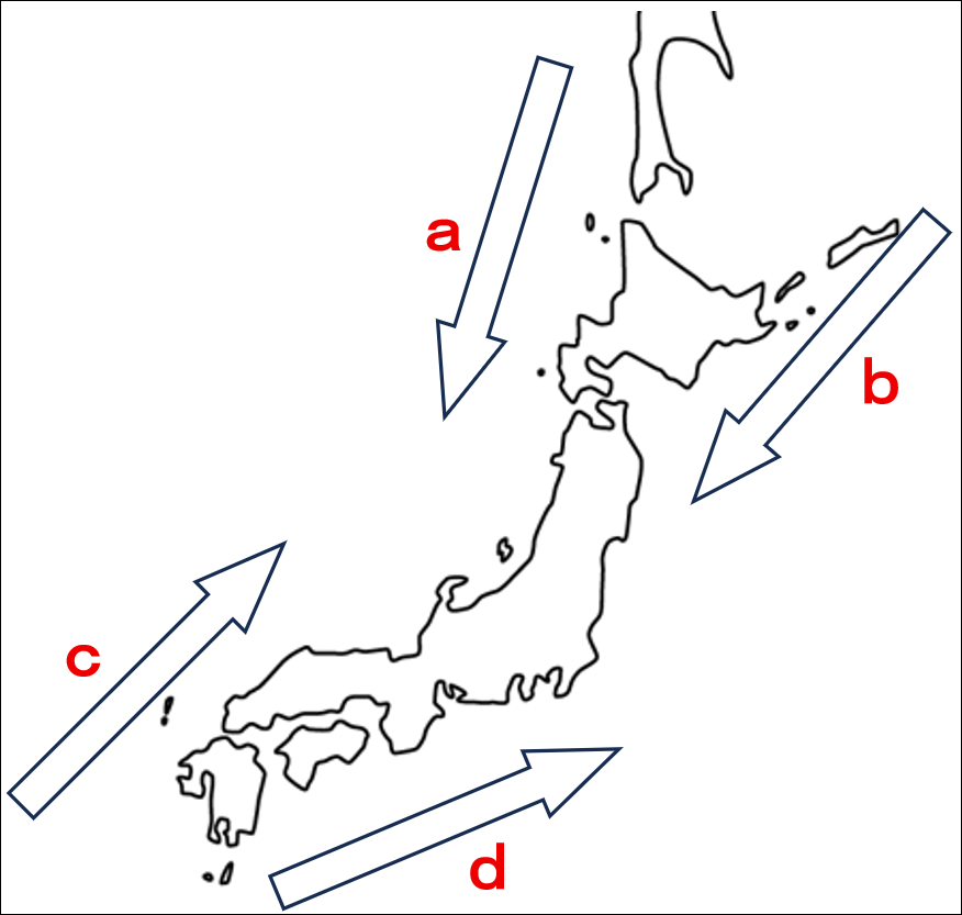 2.日本周辺の海流について、下の地図中のa~dの海流の名前をそれぞれ答えなさい。