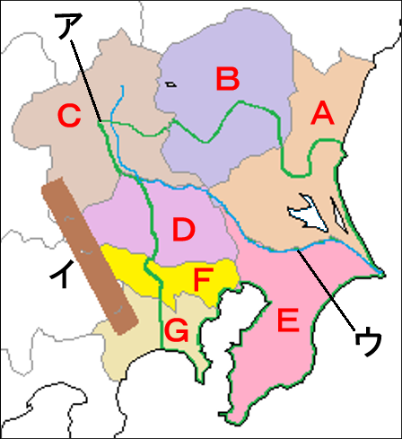 必修地理 関東地方の地図(必修) toudou 関東地方の県名と地形を確認します。 公立高校受験では、下の地図のうち、 ・A~Gの都県名、 ・アの平野、イの山地、ウの川 を最低限、おさえておきましょう。 地図の下に都県名と地形名があります。 A:茨城県 B:栃木県 C:群馬県 D:埼玉県 E:千葉県 F:東京都 G:神奈川県 ア:関東平野 イ:関東山地 ウ:利根川 必修地理にもどる