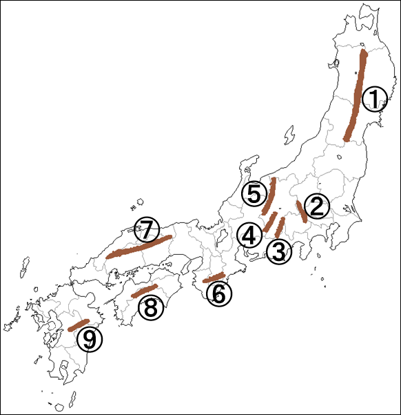 次の地図中の①~⑨の山地・山脈の名前を答えなさい。